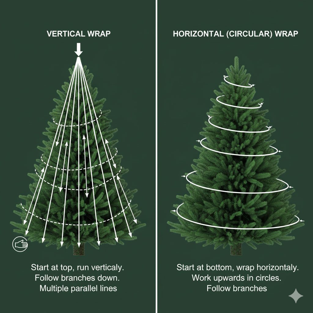 از نوک درخت شروع کن، بیا پایین، یه مقدار برو سمت چپ یا راست و دوباره برو بالا. اینطوری عمق درخت روشن میشه و وقتی چراغها رو روشن میکنی، انگار کل درخت داره میدرخشه نه فقط شاخههای بیرونی.